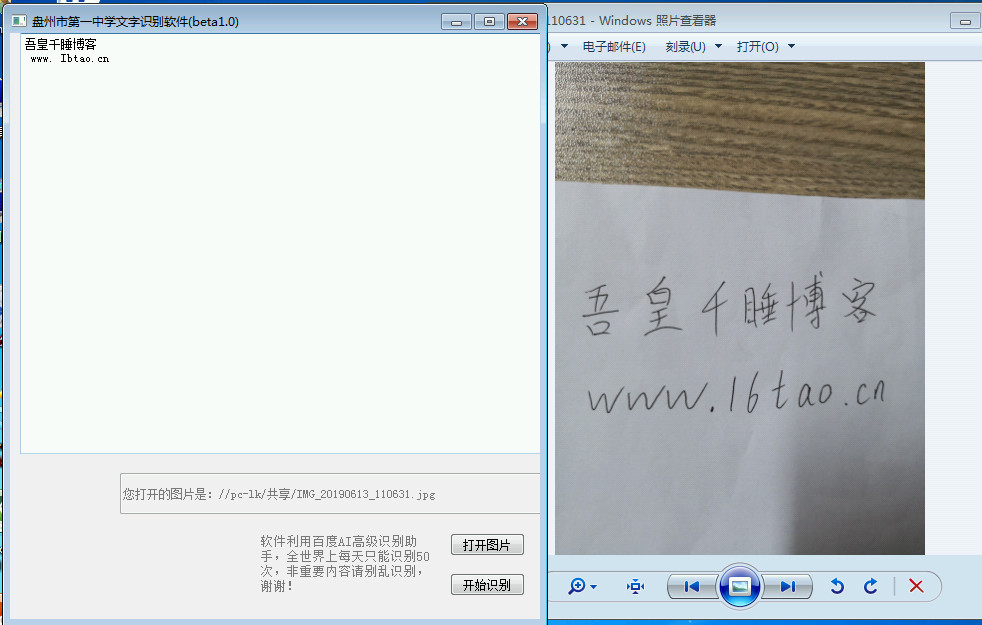 盘州市第一中学文字识别软件(简称:盘州一中文字识别助手)是一款绿色免费,简单实用的图片文字识别软件。程序利用的是百度高级AI识别助手接口,能够帮助用户识别图片中的文字,虽然在使用方面,每天只能识别50次,不过在效果方面还是非常不错的,包括可以识别手写字体,操作简单,导入图片即可一键识别