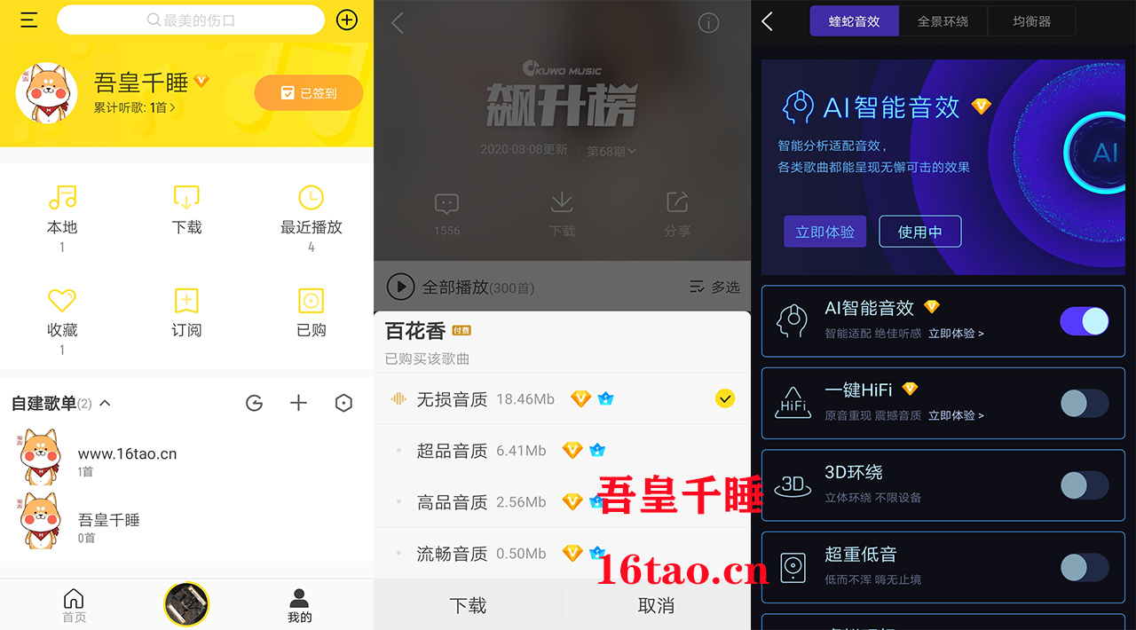 安卓酷我音乐豪华VIP破解版,吾皇千睡网站分享直接破解豪华VIP特权,破解付费音乐包特权,无需开通音乐包即可下载付费音乐,破解版权音乐限制,版权音乐也可以直接下载,破解HiFi音乐的下载数量限制,所有皮肤免费下载使用,包括vip、豪华vip、付费音乐包和付费专辑的所有皮肤,移除广告,去除启动广告及音频广告。