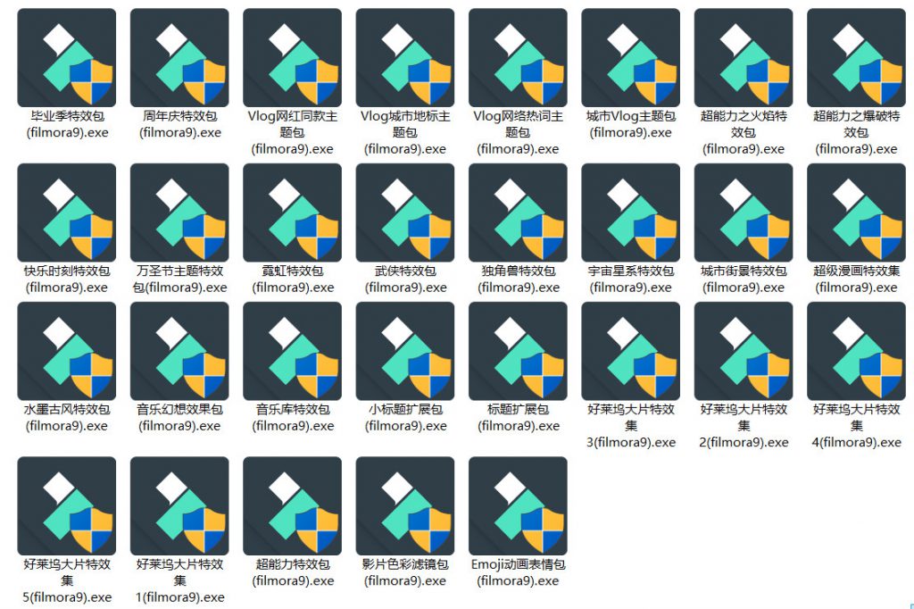 特效包包括:Emoji动画表情包、Vlog城市地标主题包、Vlog网红同款主题包、Vlog网络热词主题包、万圣节主题特效包、周年庆特效包、城市Vlog主题包、城市街景特效包、好莱坞大片特效集1、好莱坞大片特效集2、好莱坞大片特效集3、好莱坞大片特效集4、好莱坞大片特效集5、宇宙星系特效包、小标题扩展包、影片色彩滤镜包、快乐时刻特效包、标题扩展包、武侠特效包、毕业季特效包、水墨古风特效包、独角兽特效包、超级漫画特效集、超能力之火焰特效包、超能力之爆破特效包、超能力特效包、霓虹特效包、音乐幻想效果包、音乐库特效包。