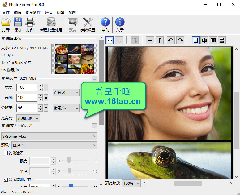 BenVista PhotoZoom Pro 中文特别版及注册机资源由吾皇千睡16tao.cn网站精选收集互联网资源并整理相关资源发布。PhotoZoom 是一款新颖的、技术上具有革命性的对数码图片进行放大的工具。通常的工具对数码图片进行放大时,总会降低图片的品质,而这款软件使用了S-SPLINE技术(一种申请过专利的,拥有自动调节、高级的插值算法的技术),是一个效果很好的图像放大软件,采用优化算法,可以将尽可能地提高放大图片的品质。