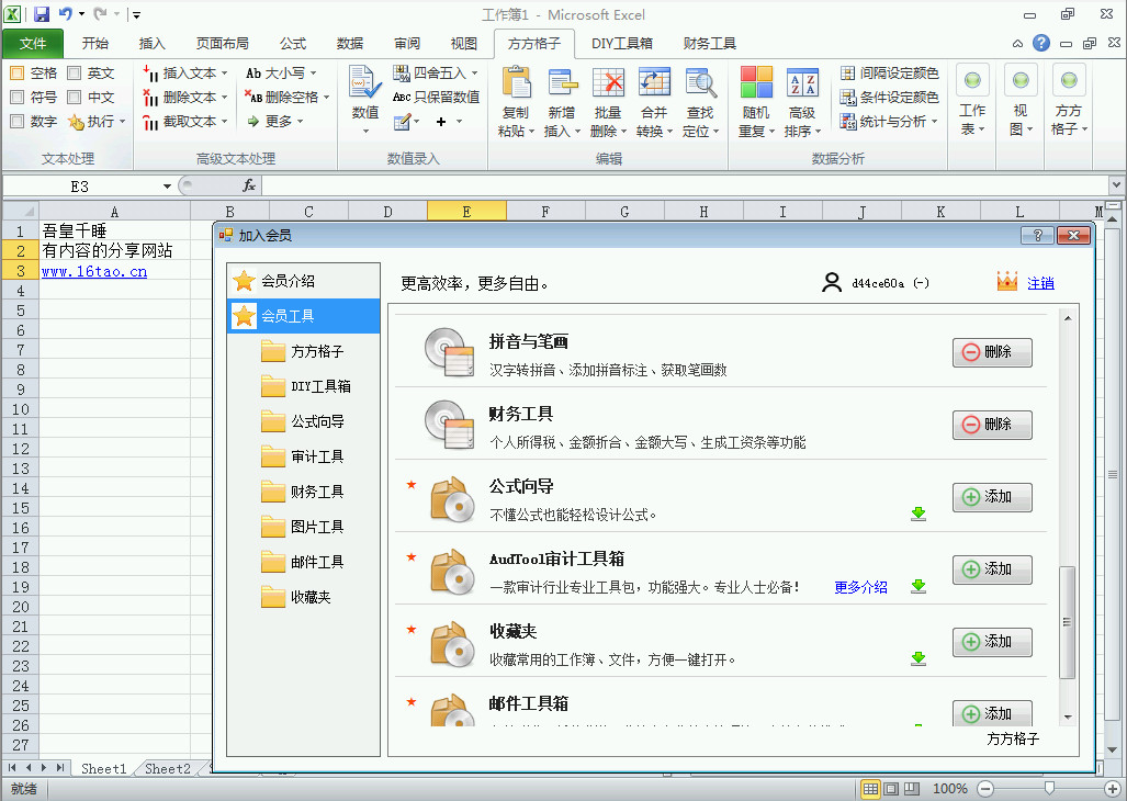 会员工具:汇总拆分(含汇总大师)、导航、图片专题工具、快查快录、身份证工具、拼音笔画、打印专题、邮件群发、翻译、财务工具等。