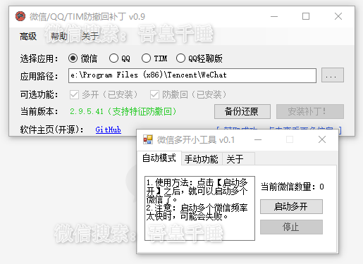 今天吾皇千睡给大家带来的就是微信防撤回和多开补丁,防撤回多开补丁代码开源,安全可靠,支持多个版本。使用也非常简单,只需要点击补丁安装即可。