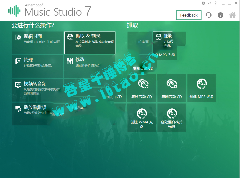 Ashampoo Music Studio 7 是处理音乐和音频文件的完整解决方案。可以录制、抓取、刻录、剪辑、转换以及混淆歌曲。管理您的音频收藏,创建播放列表,设计并打印封面 – 一切只需点点鼠标就能快捷完成!无论是电脑、手机、MP3 或是汽车中,想听就听,让您在任意设备中都能享受您最爱的歌曲!