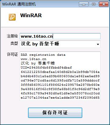 2.打开注册机,输入注册信息。比如“吾皇千睡”,点击 保存许可证,选择保存路径为WinRAR的软件安装路径下