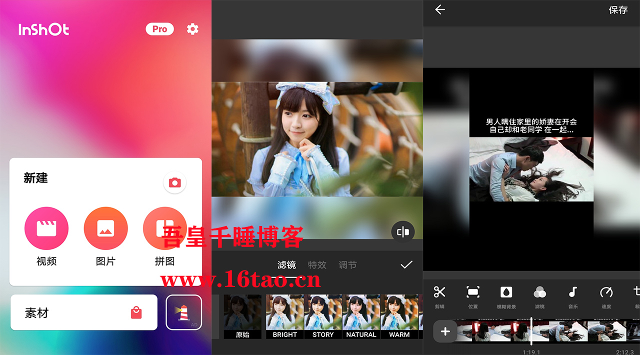 安卓视频照片编辑器 InShot Pro 中文版由吾皇千睡(www.16tao.cn)发布。该软件在视频制作之后,可以一键分享至其他社交平台,比如朋友圈,抖音,快手,YouTube,Instagram 等。网上那些短视频培训课程,给你提供的照片处理软件,都有这一款软件。