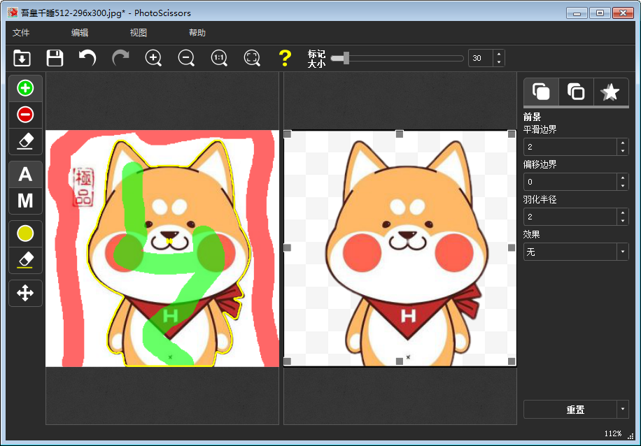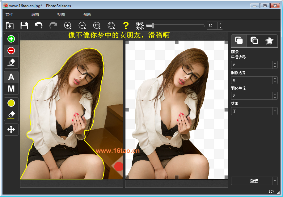 PhotoScissors 是一款由 TeoreX 公司开发的非常容易使用的智能抠图工具,也可以叫做图片背景去除工具,它实现了智能的前景与背景分割方式。请查看下方的两张截图,这是吾皇千睡16tao.cn只用了几秒钟抠出来的,抠图就是如此简单!程序能够准确地覆盖你想要去除的任何一个细节区域。这无疑为许多热爱拍照但又不精通 Photoshop 等专业照片修图的人提供了很多的方便!