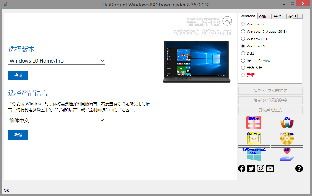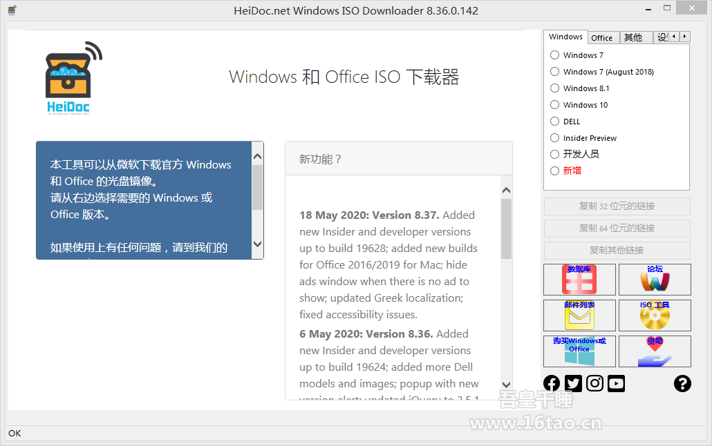 本文有吾皇千睡16tao.cn发布分享Windows ISO Downloader 是一个可以下载微软官方 Windows、Office 镜像的下载工具,这个新工具让您很方便地直接地从微软服务器上下载原版 Windows 7,8.1 和 10,以及 Microsoft Office 2007、2010、2013、2016 光盘镜像(ISO)。